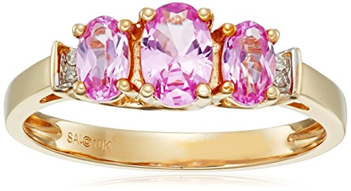 This elegant three-stone ring features a trio of oval peridot stones, prong-set in polished 10 karat yellow gold. The faceted stones have a spring green color and are accented on both sides by petite white diamonds. A graceful open trellis design below adds a note of elegance and elevates the stones above the band so that light can filter through them, enhancing their sparkle. The polished yellow gold band has squared edges and a tapered thickness in back for comfort. August's birthstone is sometimes referred to as the "evening emerald" because of the way its light green color remains visible at night. Legend has it that this beautiful gemstone was a favorite of Cleopatra's. This ring is also available with birthstones for January, February, March, April, May, June, July, September, October, November, and December.Feature