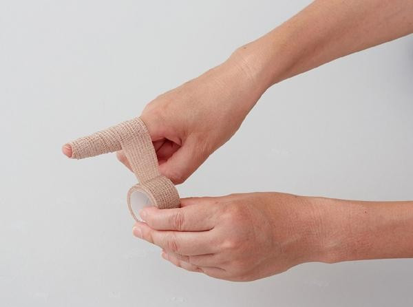 | ラテックスとアクリルを含まず、また、通気性に優れ、肌に優しい包帯です。疎水性で水をはじきます。自着機能により粘着テープ等による固定が不要で、手で裂くこともできます。 |