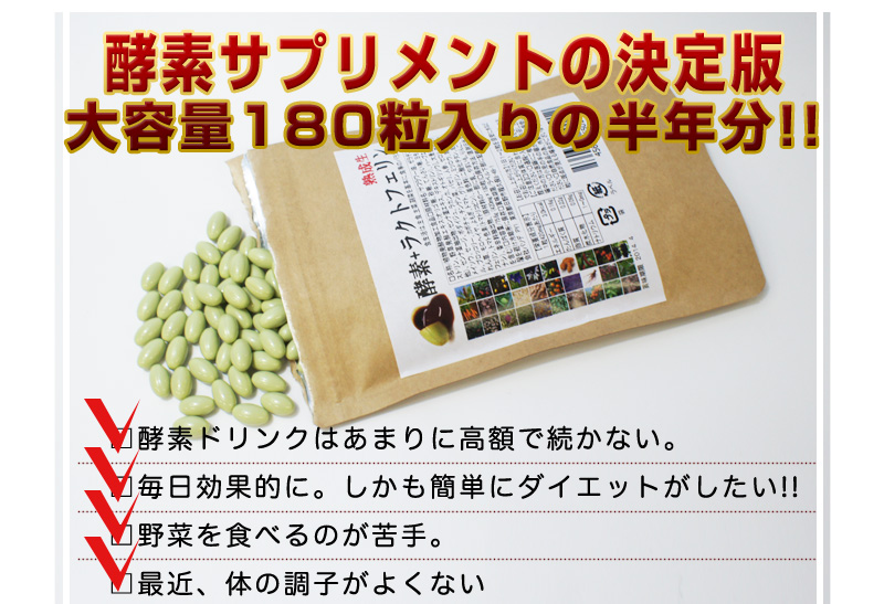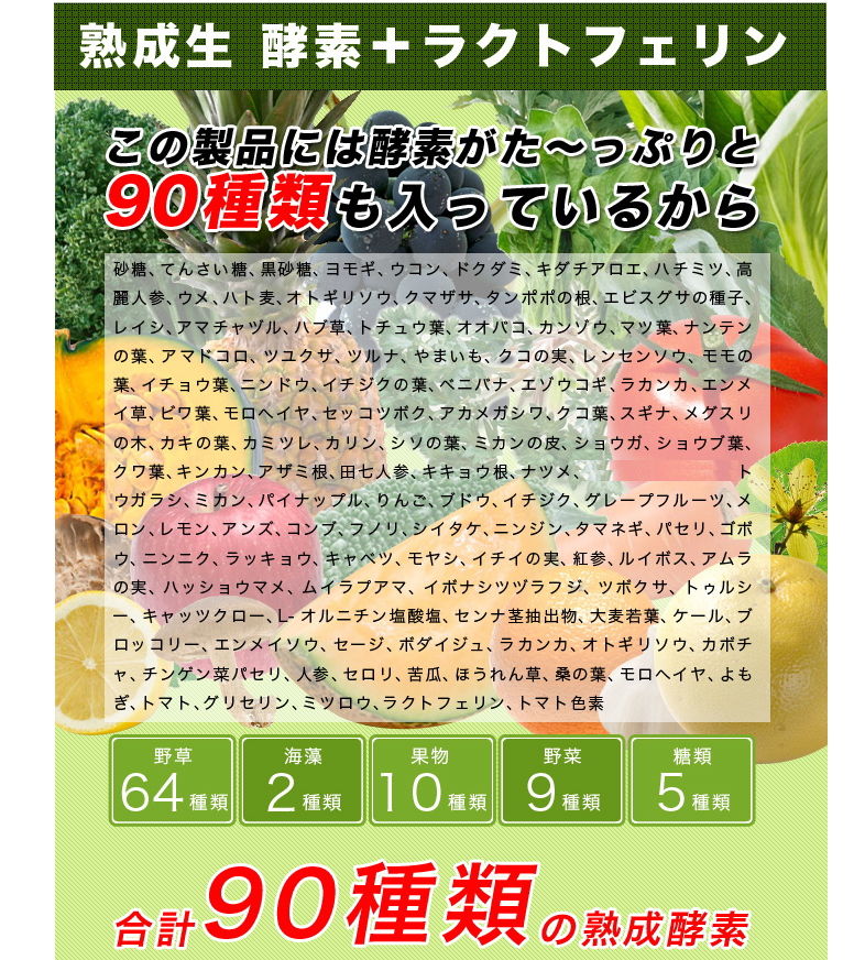 サ フラワー油、ゼラチン、デキストリン、野草発酵エキス(オリゴ糖,砂糖,てんさい糖,ヨモギ,ウコン,黒砂糖,ドクダミ,キダチアロエ,ハチミツ,高麗人 参,ウメ,ハト麦,オトギリソウ,クマザサ,タンポポの根,エビスグサの種子,レイシ,アマチャヅル,ハブ草,トチュウ葉,オオバコ,カンゾウ,マツ葉, ナンテンの葉,アマドコロ,ツユクサ,ツルナ,やまいも,クコの実,レンセンソウ,モモの葉,イチョウ葉,ニンドウ,イチジクの葉,ベニバナ,エゾウコ ギ,ラカンカ,エンメイ草,ビワ葉,モロヘイヤ,セッコツボク,アカメガシワ,クコ葉,スギナ,メグスリの木,カキの葉,カミツレ,カリン,シソの葉,ミ カンの皮,ショウガ,センシンレン,クワ葉,キンカン,玉ねぎ外皮,田七人参,キキョウ根,ナツメ,サラシア,トウガラシ,ミカン,パイナップル,りん ご,ブドウ,イチジク,グレープフルーツ,メロン,レモン,アンズ,コンブ,フノリ,シイタケ,ニンジン,タマネギ,パセリ,ゴボウ,ニンニク,ラッキョ ウ,キャベツ,モヤシ,イチイの実,紅参,ルイボス,アムラの実,ハッショウマメ,ムイラプアマ,イボナシツヅラフジ,ツボクサ,トゥルシー,キャッツク ロー)、