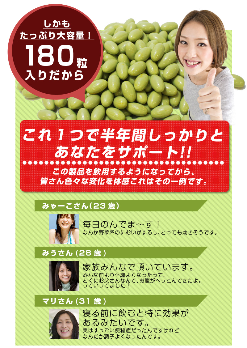 センナ茎抽出物(センナ茎エキス、デキストリン)、ハーブエキス[エンメイソウ、セージ、ボダイジュ、ラカンカ、オトギリ ソウ]、大麦若葉、ケール、ブロッコリー、カボチャ、チンゲン菜、パセリ、人参、セロリ、苦瓜、ほうれん草、モロヘイヤ、よもぎ、トマト、グリセリン、ミ ツロウ、乳化剤、ラクトフェリン、トマト色素(トマトリコピン)、着色料(二酸化チタン、紅花黄、クチナシ)、香辛料抽出物、(原材料の一部に乳、やまい も、りんご、ゼラチンを含む)