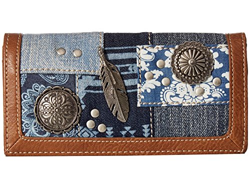 Wallet is made of multiple denim fabrics in solid shades of blues and patterns, trimmed with tumbled synthetic leather.
