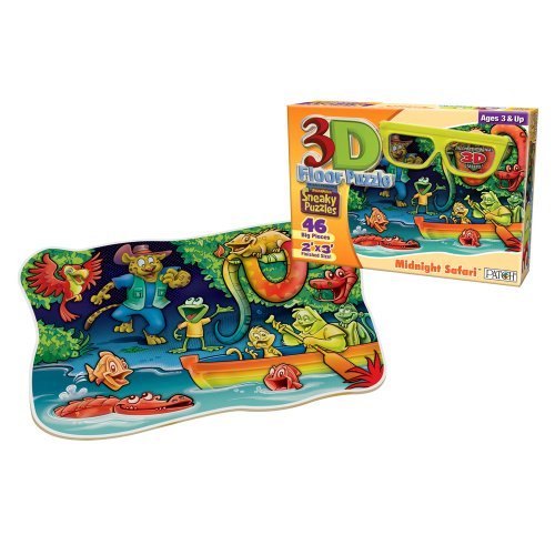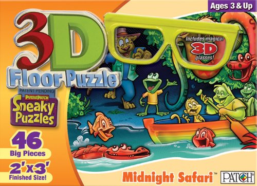 -. Binding : Toy -. Brand : Patch -. Color : Midnight Safari -. EAN : 0754295756950 -. Feature : Products that are great fun from children to adults / High quality toys and games / Games and toys that the whole family can enjoy / Children will enjoy assembling the large floor puzzle and seeing the colorful scene! / When the puzzle is finished, children can slip on the included 3D glasses and watch the puzzle take on a whole new dimension! / They also get to search for all the letters and numbers zero through nine that are hidden in the scene...how sneaky! / For ages 3 and up / Includes 46 pieces and one pair of 3D glasses; finished floor puzzle is 2 x 3 feet -. IsAdultProduct : 0 -. IsAutographed : 0 -. IsMemorabilia : 0 -. ItemPartNumber : 1414 -. Label : Patch Products -. Manufacturer : Patch Products -. Model : 1414 -. MPN : 1414 -. NumberOfItems : 1 -. PackageQuantity : 1 -. PartNumber : 1414 -. ProductGroup : Toy -. ProductTypeName : TOYS_AND_GAMES -. Publisher : Patch Products -. SKU : DB-Lin-737929 -. Studio : Patch Products -. Title : 3D Sneaky Puzzles - Midnight Safari -. UPC : 223391732002