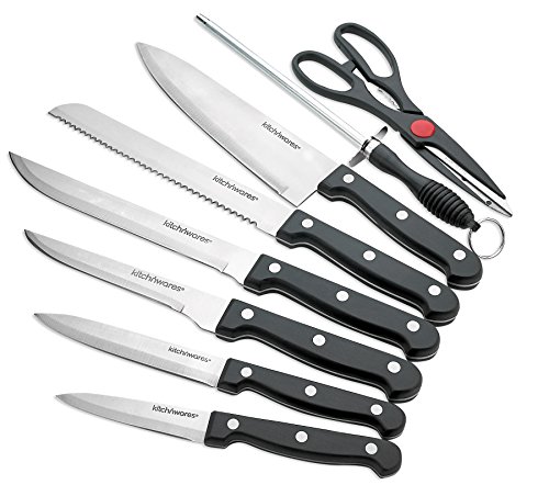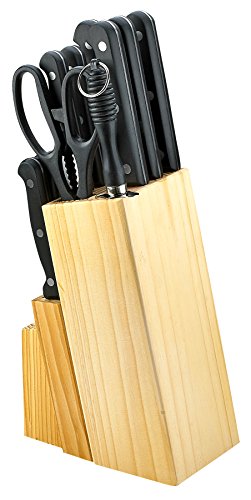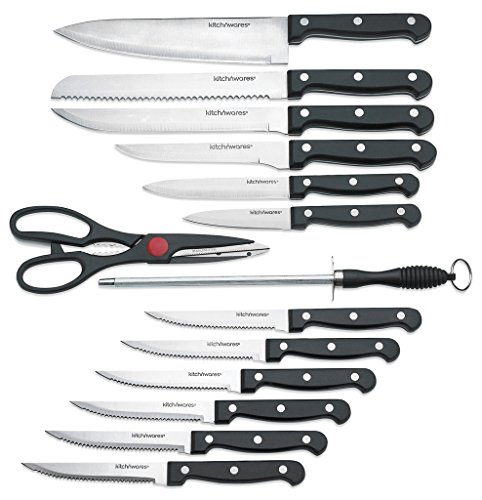 15 PIECE KNIFE SET WITH WOOD BUTCHER BLOCK - 15 PIECE CUTLERY KNIFE SET WITH KITCHEN SCISSORS AND KNIFE SHARPENER FOR CHEFS, COOKS, COMMERCIAL KITCHENS, HOMES, CULINARY SCHOOLS - USE FOR MEATS, VEGETABLES, BREADS, ETC. - BY KITCH N' WARES
