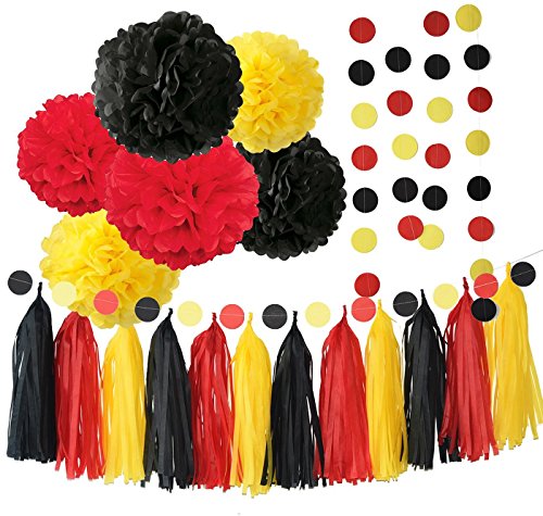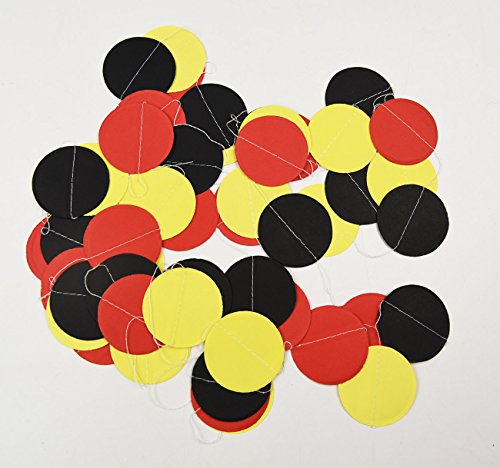 Yellow Black Red baby shower decorations/mickey 1st birthday decorations/Mickey Mouse Party decorations/Mickey Mouse Birthday/Mickey Decorations/Mickey Birthday Party Supplies/ Party tissue paper tassel garland Kit Package List: 6 pcs tissue paper flowers:2 pcs yellow(1*12inch 1*10inch) 2 pcs black(1*12inch 1*10inch) 2 pcsred Tissue Paper Pom Poms(1* 12inch 1*10inch); 1 pack of yellow black red mixed color tissue paper tassel with one white ribbon and using instruction,totally 12 sheets,each color comes with 4 pcs. 2pcs yellow black red mixed color of circle dot paper garland . Paper Garland Length: approximately 6.5 feet. Tissue Paper Craft are so much fun. They appear to float in the air, adding a cheery atmosphere to any event. Perfect for a rehearsal dinner, birthday party, bridal shower,mickey Mouse garland/Mickey Mouse decorations or casual reception. 0