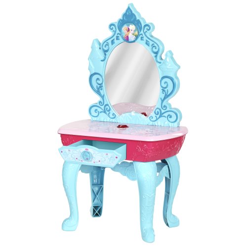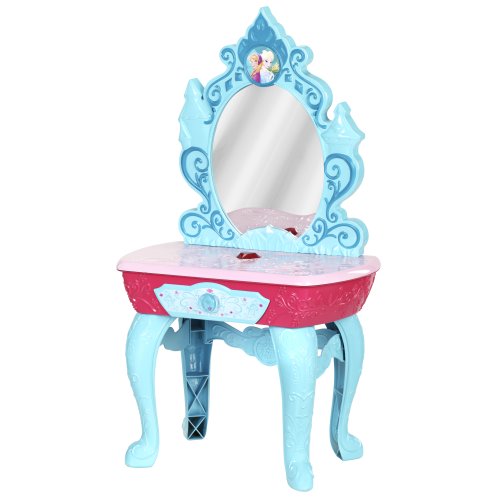 Bring home the magic of Disney's Frozen with the Crystal Kingdom Vanity! She'll love this beautiful vanity inspired by Elsa's ice castle. Press the gem button for sound effects and to see Anna and Elsa magically appear in the mirror separately and then together as the vanity plays "For the First Time in Forever." The vanity comes with fun beauty accessories, including a hair extension, comb and necklace and can be stored in the vanity's pull out drawer. Your little princess will love this musical and glamorous vanity, inspired by Disney's Frozen!Feature