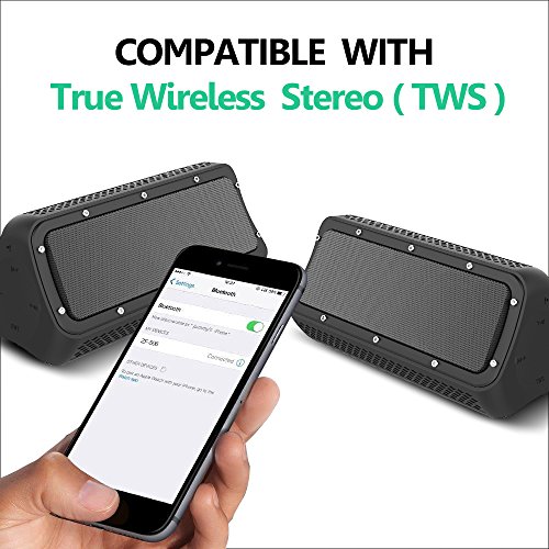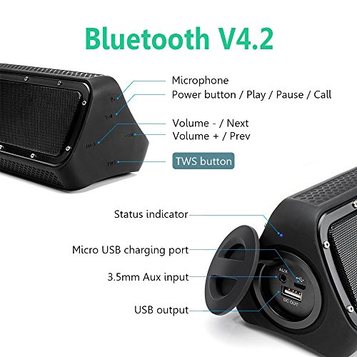 -. Feature : True Wireless Stereo: TWS technology enables you to use 2 TWS speakers pairing via Bluetooth to form a wireless left and right channel system to deliver true stereo sound effect. / Premium Stereo Sound: Crisp, clear audio with impressive volume powered by dual ten-watt drivers.The newly designed passive radiator could provide strong bass without distortion even at highest volume. / Dual Passive Subwoofers, Strong Bass, Aluminum-AlloyLatest Bluetooth 4.2 Technology: Equipped with the advanced technology,compatible with all Bluetooth compacity devices. Instantly connect your phone or tablet from up to 33 feet away. / ilt-in 4400mA Rechargeable Battery for up to 10 hours of playtime. Recharge in just 4-5 hours with included micro USB cable. Built-in microphone for hands-free speaker phone calling easy to pair. / nd sand-proof design: Safeguards the sub-woofer sound speakers against water splash, plus dust and other small particles, so you can listen to music both indoors and outdoors.