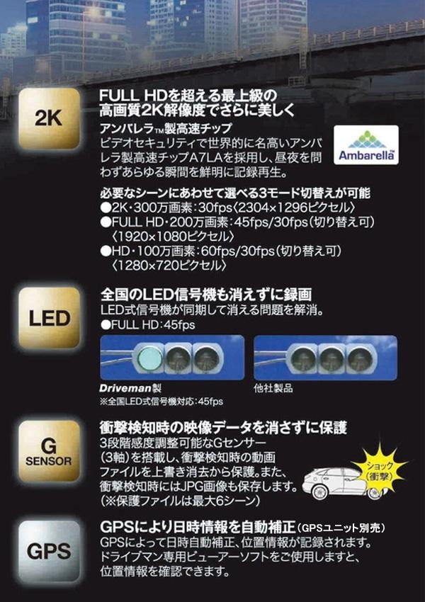 2K・300万画素の高画質モデルのドライブレコーダーです。セキュリティモードでは駐車時も録画が可能。音声と映像が確認できるので、旅先でドライブ中の風景を楽しむことができ、予期せぬ事故など万が一のトラブル発生時にも心強い味方になります。 |