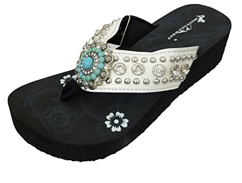Product DescriptionThese 1.75" wedge flip flops are made by Montana West. They have a turquoise colored stone concho with rhinestones.0