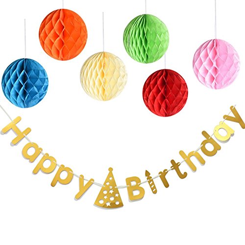 BIGTHING Happy Birthday Banner Party Decorations Supplies for Kids and Adults Gold With 6 Tissue Pom Pom Ball