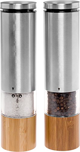Electric Salt and Pepper Grinder Set - 2 Pack Battery Operated Automatic Pepper Shaker Mills w/ LED Light and Adjustable Coarseness by Mindful Design (Stainless Steel)