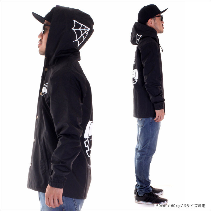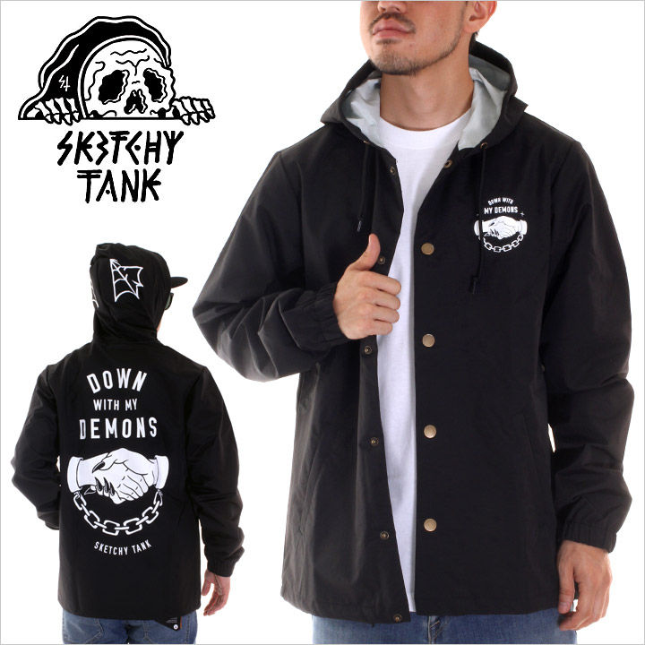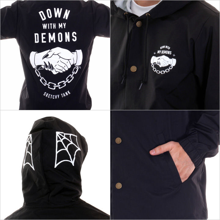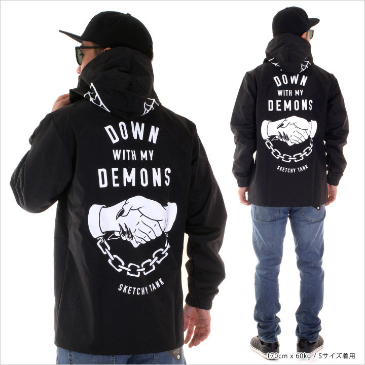 新規取り扱い"SKATCHY TANK / スケッチータンク"からフードジャケットが入荷!! 独特なマットな質感のナイロン素材のボディーに栄えるインパクト◎なイラストプリントが施された一着。 同じデザインのDEMONS SNAP BACKと組み合わせて男らしいセットアップコーディネートもお洒落にキマります。