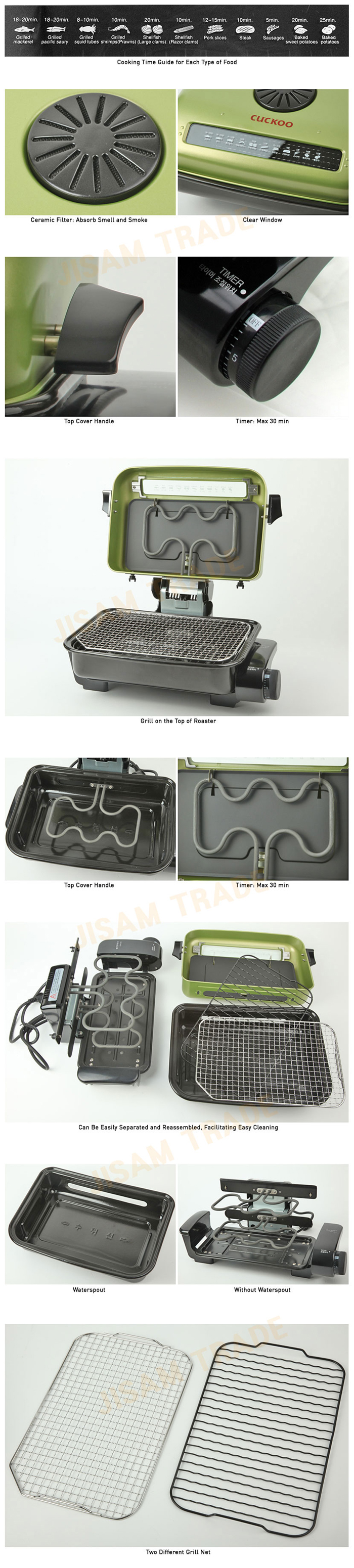The top & bottom double heating eliminates the need for repeated flips. The ceramic filter works effective in getting rid of the odor and smoke from cooking. The reversible grill wire rack and wire mesh allows cooking a wider range of thin and thick meat and vegetables.