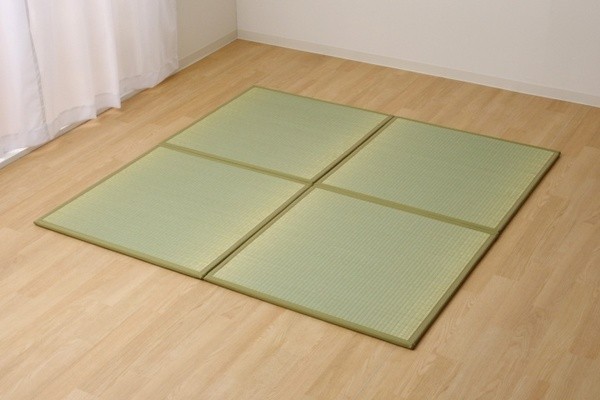 届いたユニット畳を床に置くだけで和のスペースが出来上がります。表生地には国産(九州産)のい草を使用しています。一本一本が太く、表皮が厚く繊維がキメ細かいので弾力性があり、耐久性に優れています。い草には空気の自然浄化作用、湿度の調節作用などがあります。また汚れにくく、使用するうちに黄金色に変化し、味が出ます。中材には10mmの硬わたを使用しておりますので適度なクッション性があります。裏地には滑りにくいウレタンフォームを使用しています。青森県尾ヒバの木から抽出した「ヒバエッセンス」をメーカー独自の技術で生地表面に加工しました。ヒバエッセンスにはヒノキチオールという、天然物物質としては極めて抗菌性の高い成分が含まれています(無加工品に比べ抗菌、防臭効果)。また軽量タイプなので、持ち運び、設置、片づけなども楽にできます。