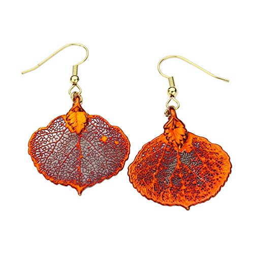 Actual aspen tree leaves has been copper-plated so that they retains their shape. The amazing filigree effect is the result of a unique manufacturing process removes some of the leaf while retaining the veins before stiffening and metal overlay. Each leaf is attached to gold-flashed stainless steel french earwires with a gold-plated brass jump ring. Leaf is approx 1.25 inches high by 1 inches wide including bail. Photo typifies this type of leaf and metal overlay. The size and shape of each leaf varies. See the Joyful Creations storefront for matching pendant necklaces. Organza gift bag included, color or style may vary.Feature