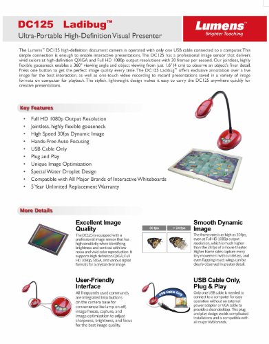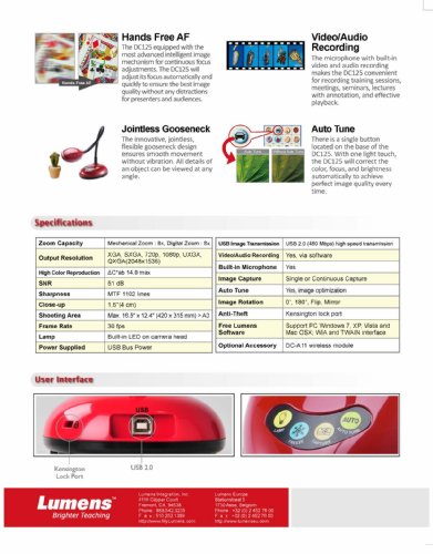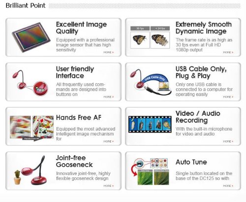 Full HD 1080p Output Resolution. Jointless, Highly Flexible Gooseneck. Hi-Speed 30fps Dynamic Image. Hands-Free Auto Focusing. USB Cable Only. Plug and Play. Unique Image Optimization. Special water droplet design. Compatible with All Major Brands of Whiteboards Zoom Capacity. Mechanical Zoom : 8x, Digital Zoom : 8x. Output Resolution. XGA, SXGA, 720p, 1080p, UXGA,QXGA(2048x1536). High Color Reproduction. Eab 8.58 (mean). SNR. 51 db. Sharpness. MTF 1102 lines. Close-up. 4 cm. Shooting Area. Max. 420 x 315 mm. Frame Rate. 30 fps. Lamp. Built-in LED on camera head. Power Supplied. USB Bus Power. USB Image Transmission. USB 2.0 (480 Mbps) high speed transmission. Video/Audio Recording. Yes, via software. Built-in Microphone. Yes. Image Capture. Single or Continuous Capture. Auto Tune. Yes, image optimization. Image Rotation. 0˚, 180˚, Flip, Mirror. Anti-Theft. Kensington lock port. Free Lumens. Software. Support PC Windows 7, XP, Vista and Mac OSX; WIA and TWAIN interface. Optional Accessory. DC-A11 wireless moduleFeature