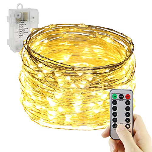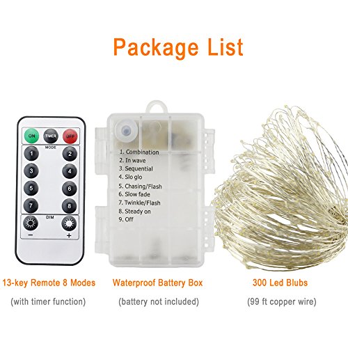 Led String Lights Battery Powered,ER CHEN(TM) 8 lighting model Waterproof 300 LED String Lights on 100 Ft Long Silver Wire with 13 Key Remote Control(Warm White)