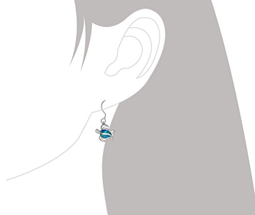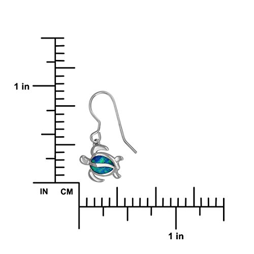 Petroglyph style turtle dangle earrings with aqua colored synthetic opal inlay. French wire. Earring measures 7/16 inch (0.44 inch) tall and 7/16 inch (0.44 inch) wide. Rhodium plated sterling silver for superior quality and shine as well as anti-tarnish properties.