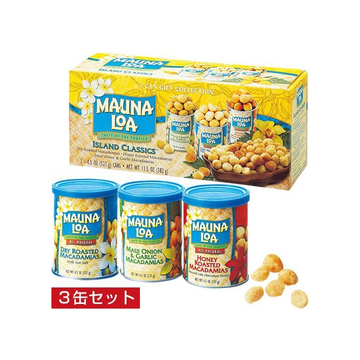 원본상품명: MAUNALOA(マウナロア) マカダミアナッツアソト3缶セット (ハワイおみやげ)