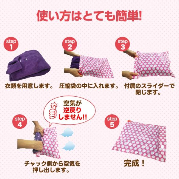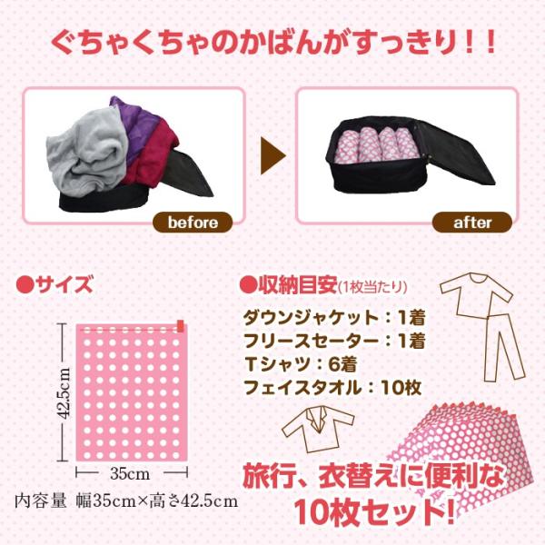 旅行や衣替えの時に便利な簡単圧縮袋のたっぷり10枚セットです。手で押すだけの、簡単圧縮!かさばる衣類などもギュッと圧縮して収納すれば、スーツケースもクローゼットやタンスもスッキリ!ここがおすすめ!●1袋に1個スライダー付だから安心●抜いた空気が戻らない逆支弁付●旅行の時のスーツケースがスッキリ!自宅の収納ケースもスッキリ!●お得な10枚セット●お洒落なピンクの水玉(裏面は透明)【収納目安】ダウンジャケット:1着/フリースセーター:1着/Tシャツ:6着/フェイスタオル:10枚■サイズ :幅35cm×高さ42.5cm       ■材質  :圧縮袋   :ナイロン、ポリエチレン      スライダー:ポリプロピレン【衣類用圧縮袋】■サイズ:幅35cm×高さ42.5cm■材質 :圧縮袋:ナイロン、ポリエチレン/スライダー:ポリプロピレン