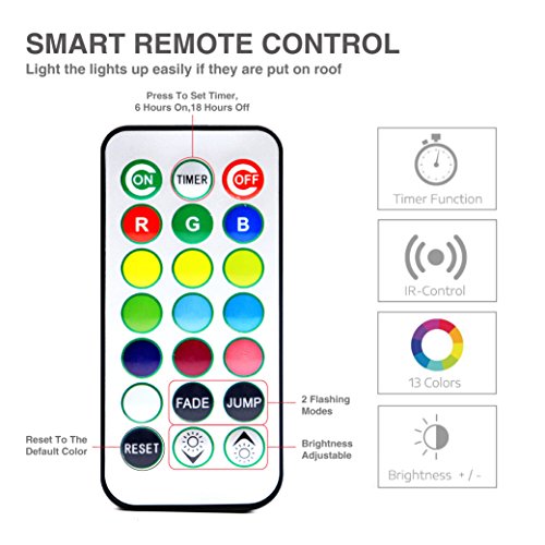 - [REMOTE CONTROL] - 21 key remote adjusts color, brightness and modes. 10 brightness are available. 3 options of lighting modes:Steady on/Fade/Jump. Intelligent memory function: the remote controller takes you back to the mode you were in when you turned the light off.