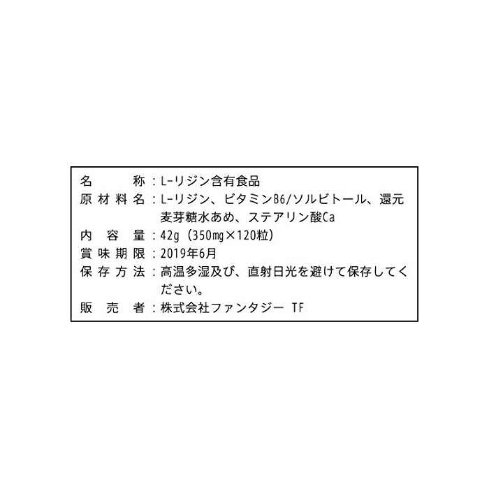 원재료:L-lysine(1알에 250mg 포함되어 있습니다.)고, 스테아린산 칼슘,솔《비토루》,비타민B6,환원 맥아당 물엿.정제의 총중량은,314mg입니다.원료에도 구애되어 있으므로,국산의 L-lysine100%물건을 사용 하고 있습니다.또한 제품의 제조에 관계되는 모든 공정도 일본 국내에서 실시하고 있습니다.