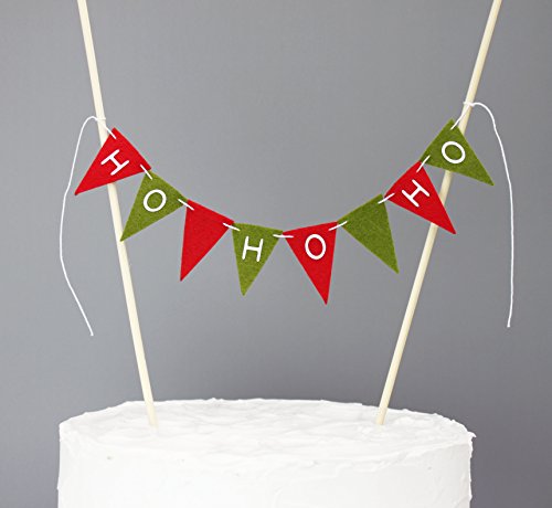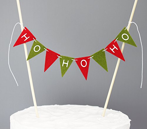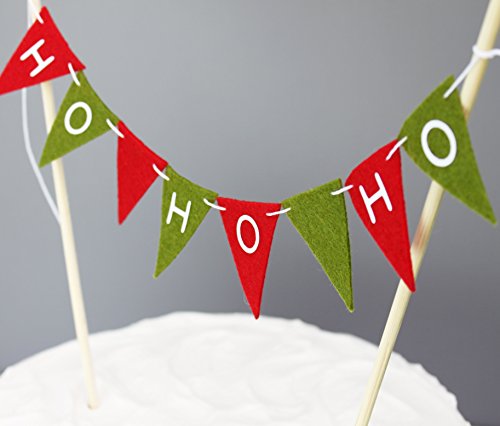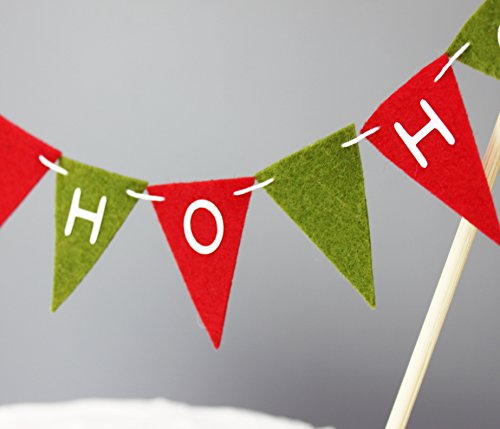Product Description Festive mini cake bunting banner made from tiny moss green and bright red felt flags and white uppercase letters that spell HO HO HO. Will add a festive touch to your Christmas table decor. Banner measures just over 8 inches across and is fully assembled and ready to use right out of the package. Comes pre tied on two bamboo skewers. 0