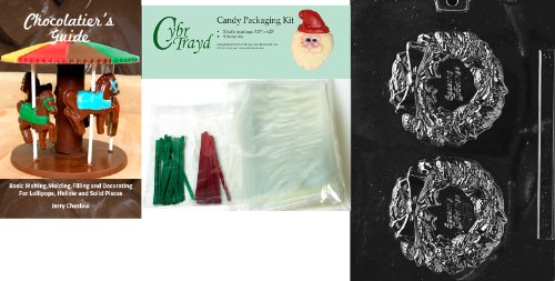 Cybrtrayd Seasons Greetings Wreath Chocolate Mold with Chocolatier's Bundle of 50 Cello Bags, 25 Green and 25 Red Twist Ties and Chocolatier's Guide