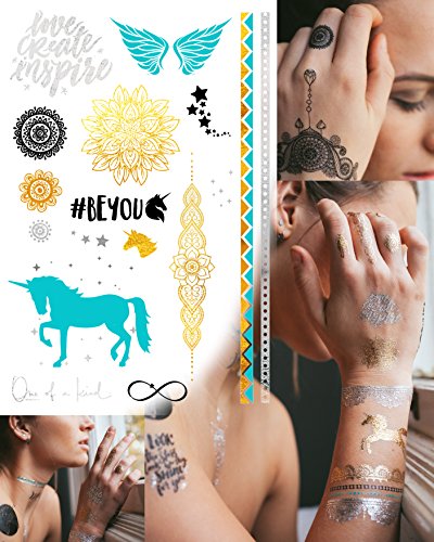 Studio : crazy possible Publisher : crazy possible Binding : Misc. Product Description Beautiful gold, silver, turquoise, black and teal waterproof flash temporary tattoos with inspirational and empowering messages great for kids and adults. Just like Dr Emoto's work with words and water, our bodies are made of 80% water. Raise your vibration with using high vibration words on your body! Great for festivals, birthday parties, night out, weddings, bridal showers, halloween, beach or just for everyday fun to glam up your look. Adorn your beautiful body! 5 Sheets including 85 images of shimmering henna tattoos. Images include unicorns mandalas, wrist and ankle bands, wings, flowers, stars, hearts, dandelion. Sayings include: Love Create Inspire #beyou #iampossible Make Your Own Magic inspire Shine Know be preceive receive Unicorn life Ask2Receive Believe in you Magic Choosing for me #unicornceo Crazy Possible What is possible now? Just be you? #IBeliveInMagic Magic is all around us #unicornlife Look at the stars look how they Shine for you Be magic Unicorn Magic #crazypossible love Tattoos are made in the USA, non-toxic, and last 4-5 days. Easily removed with baby oil. Simple Application: 1) Clean and dry skin completely. 2) Cut out design of your choice and remove transparent sheet. 3) Place temporary tattoo face down on skin. 4) Press damp cloth / sponge against tattoo and hold for 30 seconds. 5) Gently lift corner to check if tattoo is fully transferred. If not, damp and press again. That's it! If done correctly, your Crazy Possible Tattoos can last for several days. REMOVAL Easy to remove with baby oil, coconut oil, or olive oil. Just apply oil to the tattoo and rub off, it's that simple! We love happy customers! We offer 30 day money back if you do not enjoy these tattoos 0
