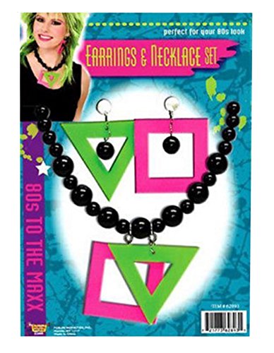-. Binding : Apparel -. Brand : Forum Novelties -. Department : womens -. Feature : 80's style neon earrings and necklace set / Geometric square and triangle shapes / One size fits most adults / Pair with additional costume pieces or everyday clothing / Made by Forum novelties, a leader in costumes and novelty items for more than 30 years -. Genre : Jewelry -. IsAdultProduct : 0 -. Label : Forum Novelties Costumes -. Manufacturer : Forum Novelties Costumes -. Model : 62893 -. PackageQuantity : 1 -. ProductGroup : Apparel -. ProductTypeName : ADULT_COSTUME -. Publisher : Forum Novelties Costumes -. Studio : Forum Novelties Costumes -. Title : Forum Women's Neon Earrings and Necklace Set