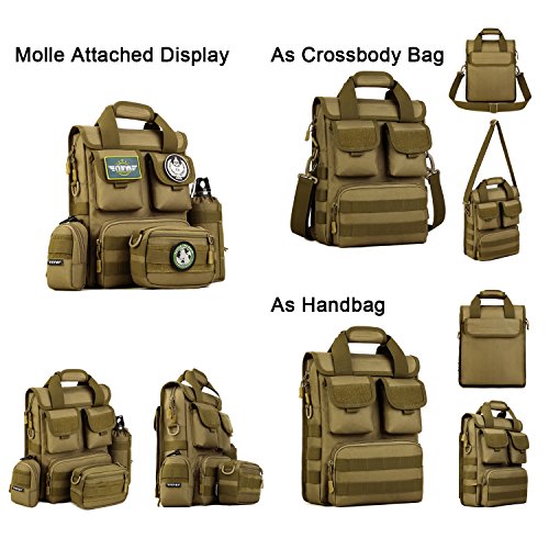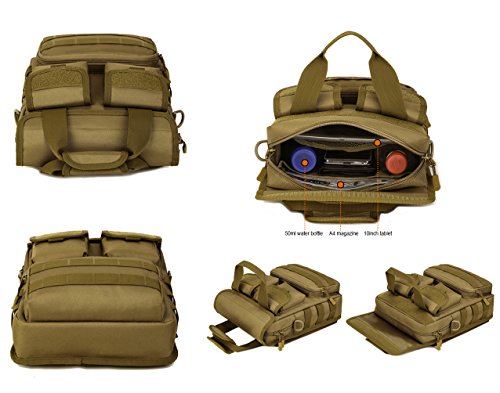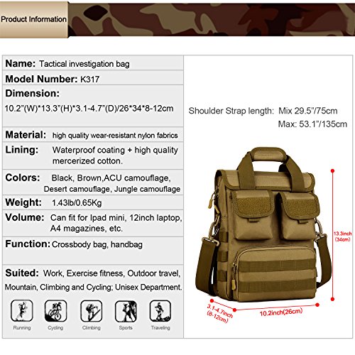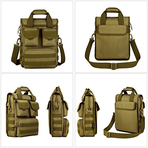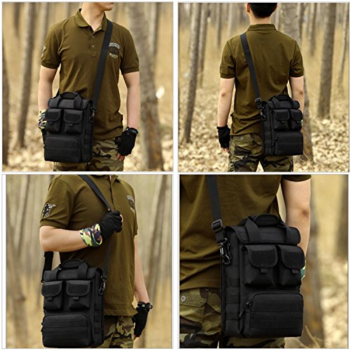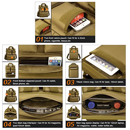 -. Feature : Materials: High density 900D nylon and canvas, high quality buckle - lightweight, durable material,scratch-resistant, not easy to fade. / Dimension:13.38''H*10.24''W*4.72''D.Adjustable shoulder strap:29.53''-59.06''. / Handy, versatile uses-Shoulder bag& Hand Carry/handbag. MOLLE external expansion system designed to be used in combination with other equipment, you can load pockets, water bottle bag, accessory kits and other tactical gears / Perfect for shopping,working,hunting,camping,travel,mountain,trekking,tactical,outdoor,cycling saddle bag. / Main pocket fit well for 12" laptop,A4 magazines,wallet,baverage bottle.The other compartment in the main pocket fit for A4 magazine,ipad,10" tablet. Back velcro pocket fit for ipad,10" pad.front zipper pocket fit for wallet,6" or below cellphones.Front two velcro pockets fit for 4.2''or below cellphone,cigarette,lighter,tissues,etc.