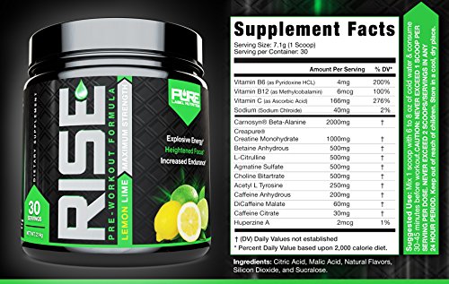 POWERFUL PRE WORKOUT FORMULATION - Our #1 Top Rated Pre-workout Powder RISE uses only the best and highest quality ingredients like Creapure® Creatine Monohydrate and Carnosyn® Beta Alanine + B Vitamins, Agmatine, L-Citrulline and Huperzine-A. Full Disclosure on Ingredients with Nothing to Hide.