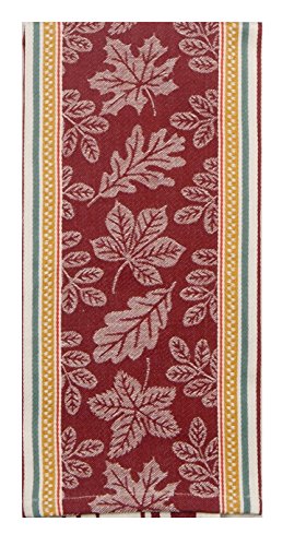 - Tea towel features intricately woven fall leaves design