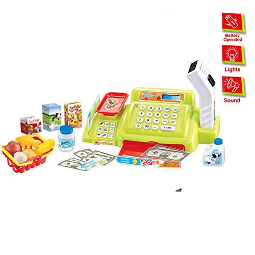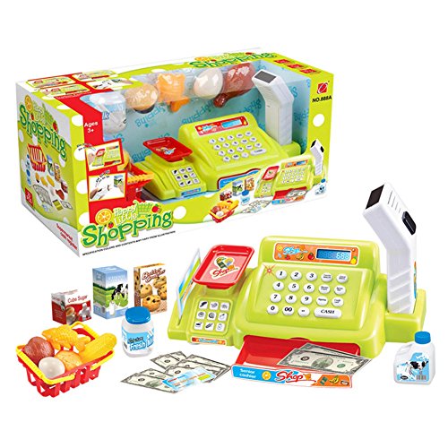 -. Feature : Set includes: Cash register with scale and scanner, pretend credit card, play money, a shopping basket and items to purchase / Food items include: muffin, chicken leg, corn on the cob, egg, fish, sugar, cookie mix, milk jug, boxed milk, and a milk drink / Fun for Kids Ages 3+ / Imitates essential real-life skill food shopping for Children's / Hours of pretend creative playing - great for toy for children to interacting with each other.