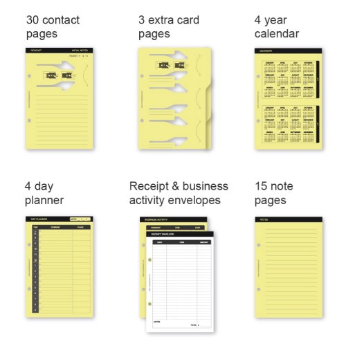 30 compact size (4.75 x 7 Inches) contact pages each with a patented business card receiver slot and room for notes