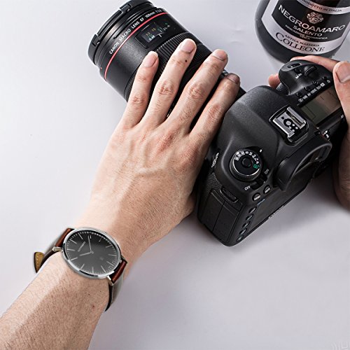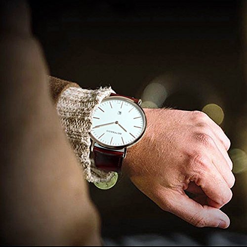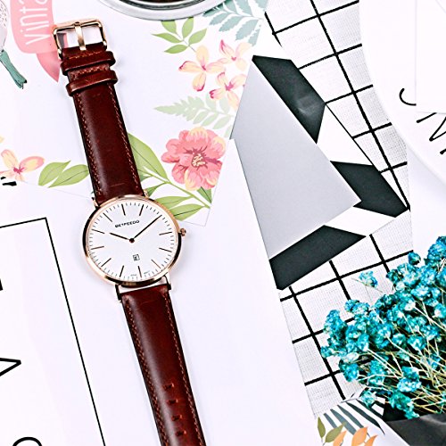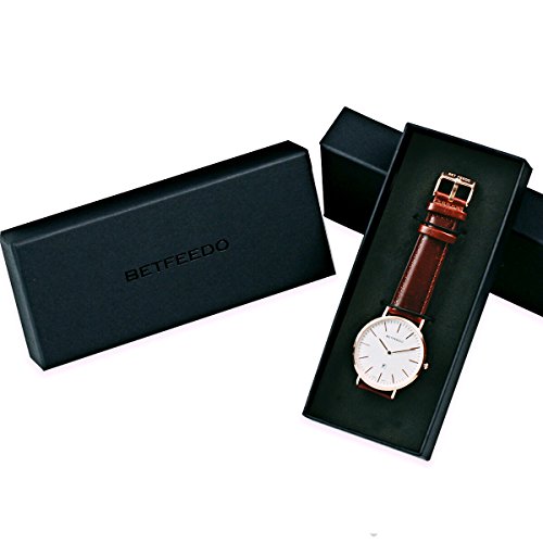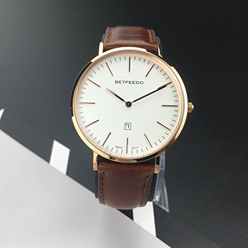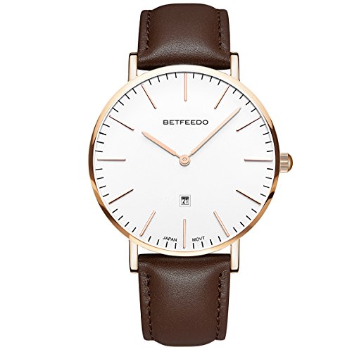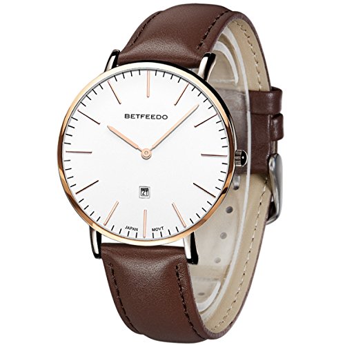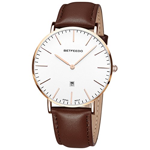 BETFEEDO Men's Ultra-Thin Quartz Analog Date Wrist Watch with Black Leather Strap (WHITE/BROWN)