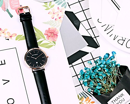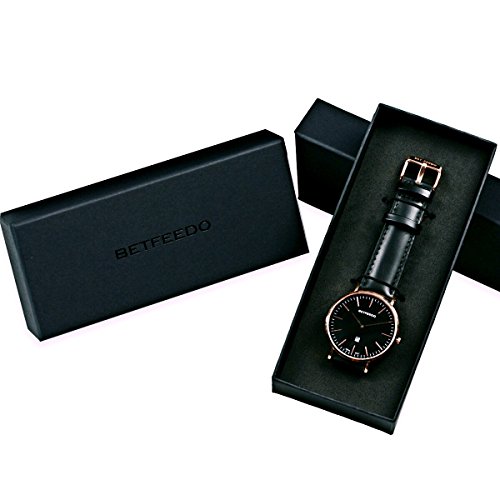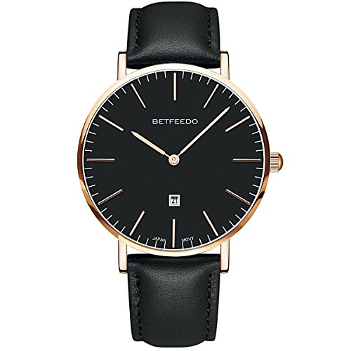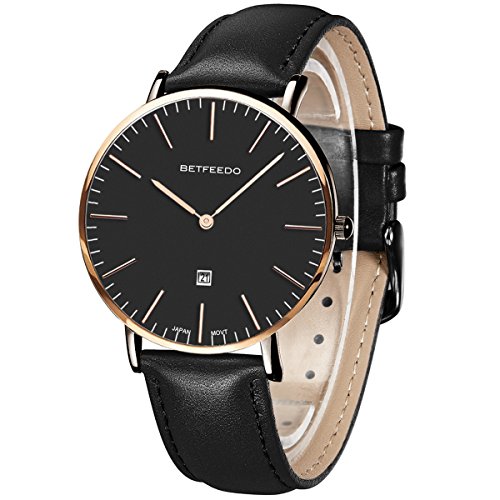 BETFEEDO Men's Ultra-Thin Quartz Analog Date Wrist Watch with Black Leather Strap (BLACK/BLACK)