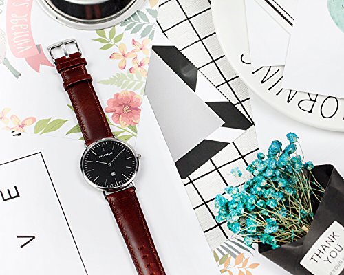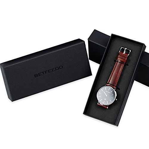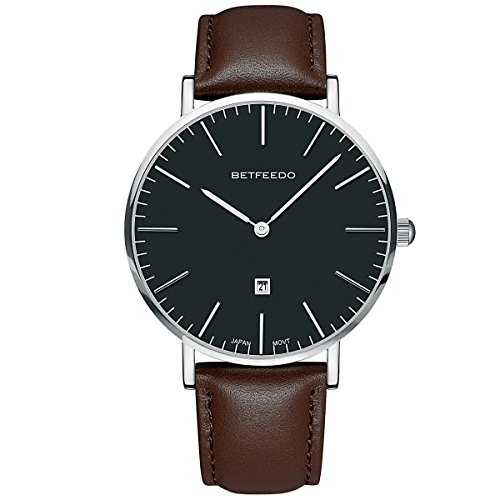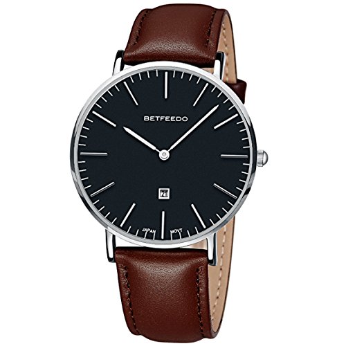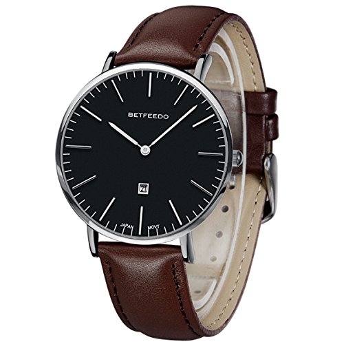 BETFEEDO Men's Ultra-Thin Quartz Analog Date Wrist Watch with Black Leather Strap (BLACK/BROWN)