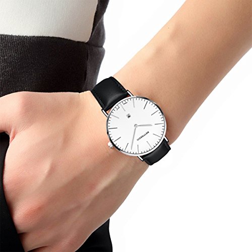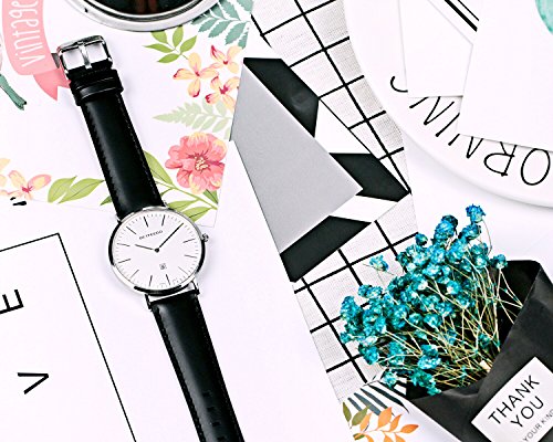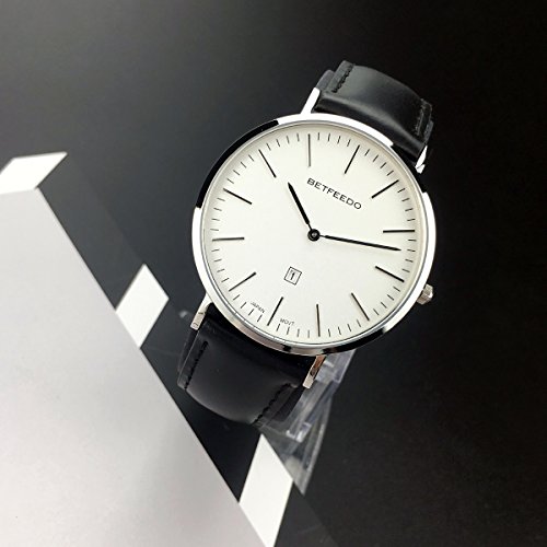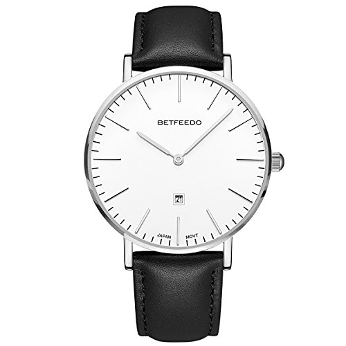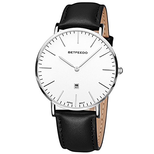 BETFEEDO Men's Ultra-Thin Quartz Analog Date Wrist Watch with Black Leather Strap (WHITE/BLACK)