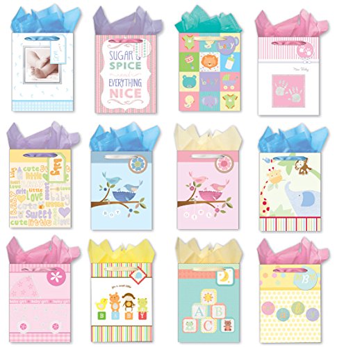 Gift Bags for Baby Shower 12 Medium Gift Bags Set of Paper Gift Bags with Handles, Packing Tissue Paper, and Baby Shower Gift Tags