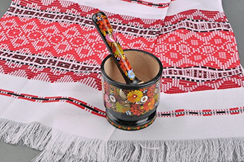 -. Feature : DETAILS - Wooden mortar and pestle are made of linden wood. Different wood species can be used: oak wood, pear wood, nut wood, beech wood and others. Product is decorated with Petrikivsky painting, which is a national brand of Ukraine. This is a beautiful and functional product! /