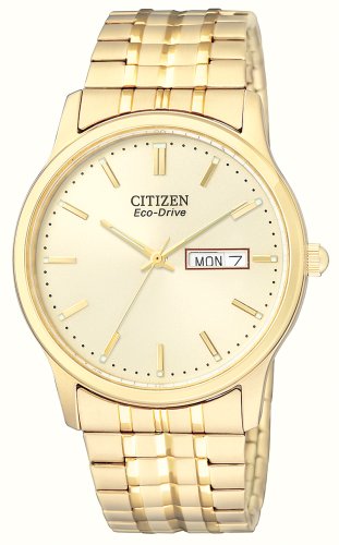 Polished and refined, the Men's Gold-Tone Watch from Citizen Eco-Drive is both and fashionable. Powered by either natural or indoor light, this versatile timepiece features gold-plated stainless steel construction for a classic look, and a super durable, hardened mineral crystal to guard against wear and tear. A power reserve of 180 days, and a low charge warning within seven days of stop state, ensure consistency and reliability, while a luminous champagne dial features a day and date display at three o'clock to help keep you organized. And a flexible expansion bracelet provides all-day comfort. Streamlined and elegant, this Citizen original arrives in a gray box, along with a manual, information CD.Feature