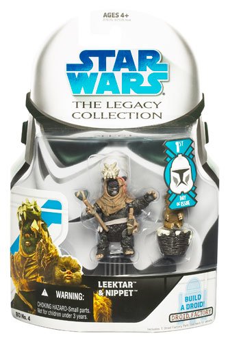 -. Binding : Toy -. Brand : Hasbro -. EAN : 0653569330356 -. Feature : Action figures, based on the characters from the Star Wars film series, come with a DroidTM Factory / Figures come with a weapon, basket and 1 Droid Factory part. / Ages 4 and up. -. Label : Hasbro -. Manufacturer : Hasbro -. Model : 87676 -. MPN : 87676 -. PackageQuantity : 1 -. PartNumber : 87676 -. ProductGroup : Toy -. ProductTypeName : TOYS_AND_GAMES -. Publisher : Hasbro -. Studio : Hasbro -. Title : Star Wars The Leagacy Collection Ewoks Leektar and amp; Nippert Action Figure -. UPC : 653569330356
