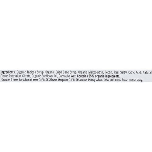 -. Binding : Health and Beauty -. Brand : Clif Shot Bloks -. Color : Margarita -. EAN : 0722252380678 -. Feature : Salt the rim - this flavor has 3x sodium to ward off muscle cramps. / USDA Certified Organic / 3x sodium / Simple-to-handle and easy-to-chew -. IsAdultProduct : 0 -. Label : Clif Shot Bloks Energy Chews -. LegalDisclaimer : Actual product packaging and materials may contain more and different information than what is shown on our website. We recommend that you do not rely solely on the information presented and that you always read labels, warnings, and directions before using or consuming a product. Please see our full disclaimer below. -. Manufacturer : Clif Shot Bloks Energy Chews -. MPN : 432866 -. NumberOfItems : 18 -. PackageQuantity : 18 -. PartNumber : 432866 -. ProductGroup : Health and Beauty -. ProductTypeName : HEALTH_PERSONAL_CARE -. Publisher : Clif Shot Bloks Energy Chews -. ReleaseDate : 2012-02-24 -. Size : 18 Count -. Studio : Clif Shot Bloks Energy Chews -. Title : CLIF BLOKS Energy Chews - Margarita with Salt - (2.1 oz, 18 Count) -. UPC : 722252380678