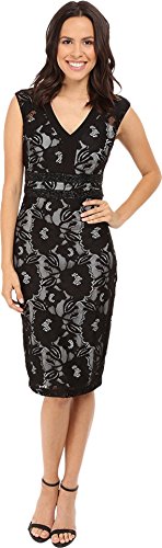 Extended sleeve v-neck midi length lace sheath with beaded waist detail