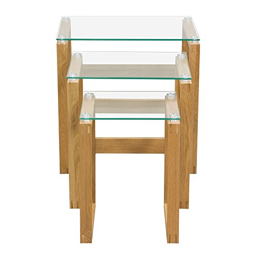 -. Feature : Includes small, medium and large table / Clear, tempered glass tops / Solid oak base with metal accents / Great accent for any room's decor / Warranty: One year