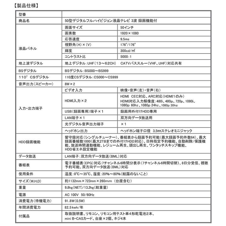 ●付属品:取扱説明書、リモコン、リモコン用テスト単4形乾電池 2本、miniB-CASカード、台座2個、ねじ4本