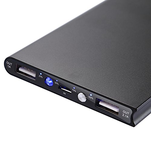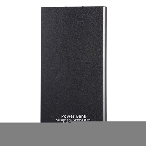 -. Feature : Slim power bank, ultra-slim design with aluminum alloy construction and a hard plastic, solid and portable, convenient to carry at anytime and anywhere / 4 LED indicators displaying battery percentage charging status with flashlight / 7,000mAh rechargeable Li-Ion battery capacity built-in dual USB outputs: 5V 1A and 5V 2.1A to fast charge two digital devices simultaneously / Authentic Capacity 2.5 full charge to iPhone 6/6S, 2 full charge to samsung S6 and 1 full charge to iPad air / Perfect compatibility with Apple, Android or other devices, lightweight and ultrathin design fits easily into any pocket or bag