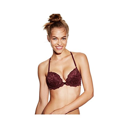 -. Feature : The Date Push-Up you love - now with a lace racerback, plunging neckline and easy front-clasp closure. / Most push. Soft, scalloped lace and light, sheer sides. Plunging neckline. Front-clasp closure / New racerback style. Padded with underwire cups. Adjustable racerback straps. Cups have signature PINK lining / Imported nylon/spandex