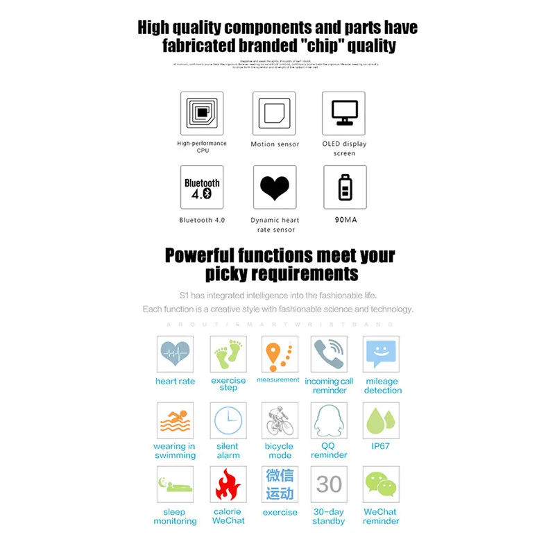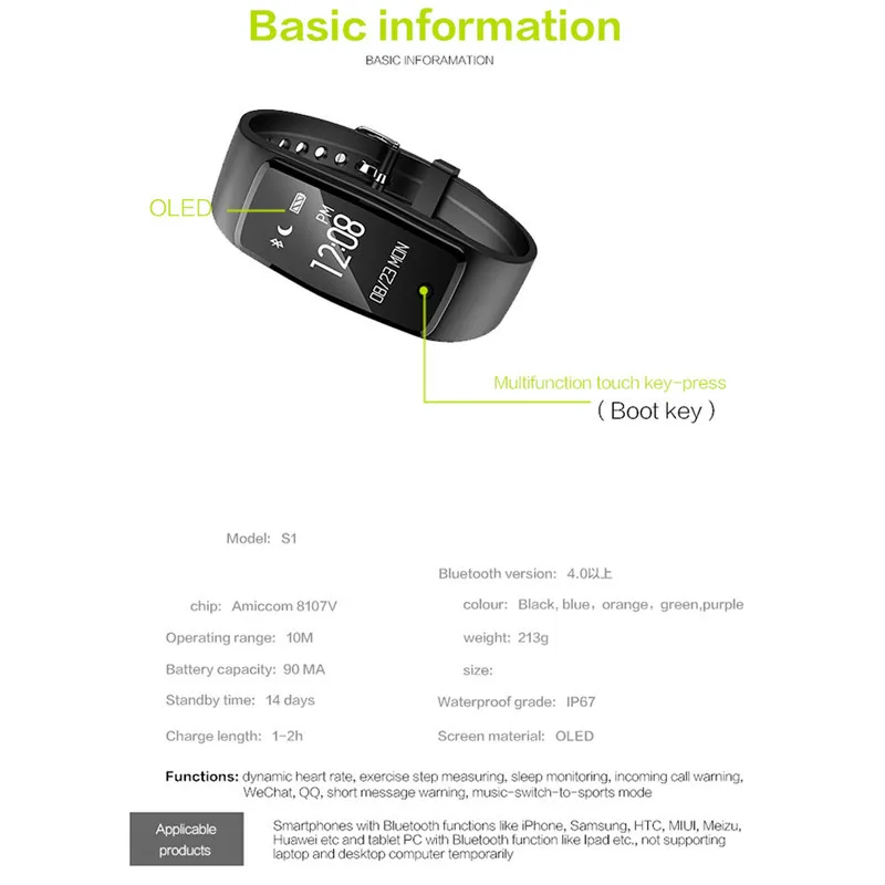 - Function:Week,Remote Control,Speed Measurement,Passometer,Social Media Notifications,Message Reminder,Sleep Tracker,Activity Tracker,Heart Rate Tracker,Call Reminder,Fitness Tracker