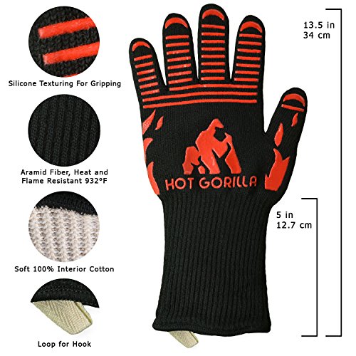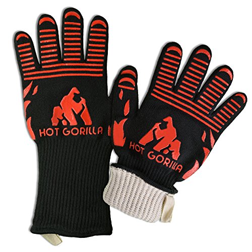 - ✅ EXTREME HEAT RESISTANT GLOVES - Hot Gorilla gloves provide heat resistant up to 932°F, EN407 certified oven and grill gloves. Extra long cuff. Made of high quality strong synthetic Aramid fibers, the same material usually used by our Proud U.S. MILITARY, FIRST RESPONDERS and FIREFIGHTERS!
